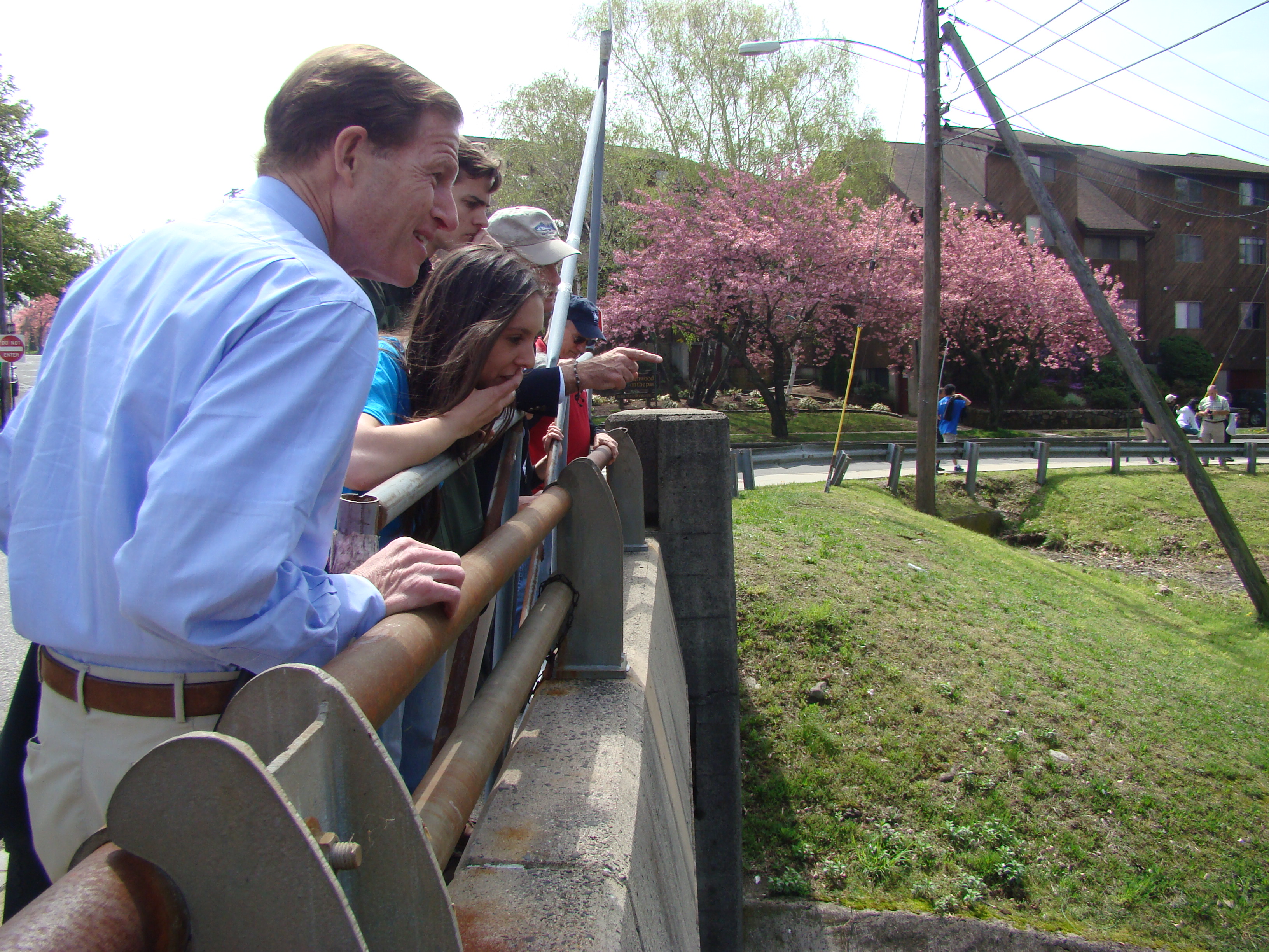 Senator Richard Blumenthal, Beardsley Zoo Director Gregg Dancho, CT DEEP Inland Fisheries Division Supervisor Steve Gephard, Sustainability Coordinator for the City of Bridgeport Christopher Anastasi and Save the Sound Executive Director Curt Johnson all said a few words celebrating the return of migrating fish to the Pequonnock River prior to the plant-a-thon.