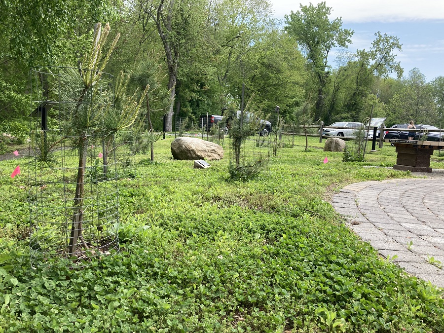 The new Greg Decker Pitch Pine Nursery, a popular pre- and post-hike gathering point in front of the Oswegatchie Hills Nature Preserve, features growing beds for Pitch Pine saplings, pollinator gardens, benches on a circular patio of paving stones, a strolling path through Pitch Pine trees, and educational signs that tell the story of this historic tree species that has disappeared from much of the state due to loss of habitat.