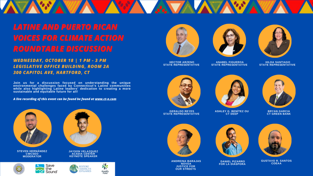 Hartford, CT – Following the conclusion of Hispanic Heritage Month/Latine Heritage Month, the Commission on Women, Children, Seniors, Equity, and Opportunity (CWCSEO) partnered with Save the Sound in convening a “Latino and Puerto Rican Voices for Climate Action Roundtable” featuring community leaders and academics, in addition to government and legislative officials. The event, held October 18 in Hartford, was convened to raise awareness about the remarkable contributions of leaders of Latin American ancestry to the environmental movement in Connecticut and sparked meaningful dialogue regarding how climate change impacts Latine communities and what should be done to combat the issue.