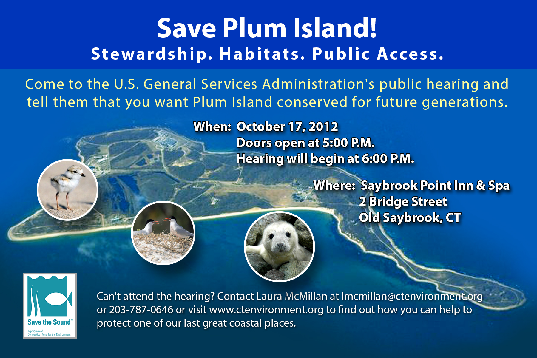 Save the Sound will be joining with Senator Richard Blumenthal, Congressman Joe Courtney, and Congresswoman Rosa DeLauro at 5 P.M. before the Connecticut hearing for a rally urging GSA to consider all of the environmental issues regarding the future sale of Plum Island. We hope to see you there!