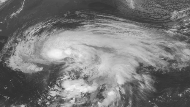 This NOAA satellite image taken Friday, Oct. 26, 2012 at 01:45 AM EDT shows Hurricane Sandy moving NNW through the northern Bahamas with a broad cloud shield covering the southeastern Atlantic Basin into the northern Caribbean.(AP Photo/Weather Underground)