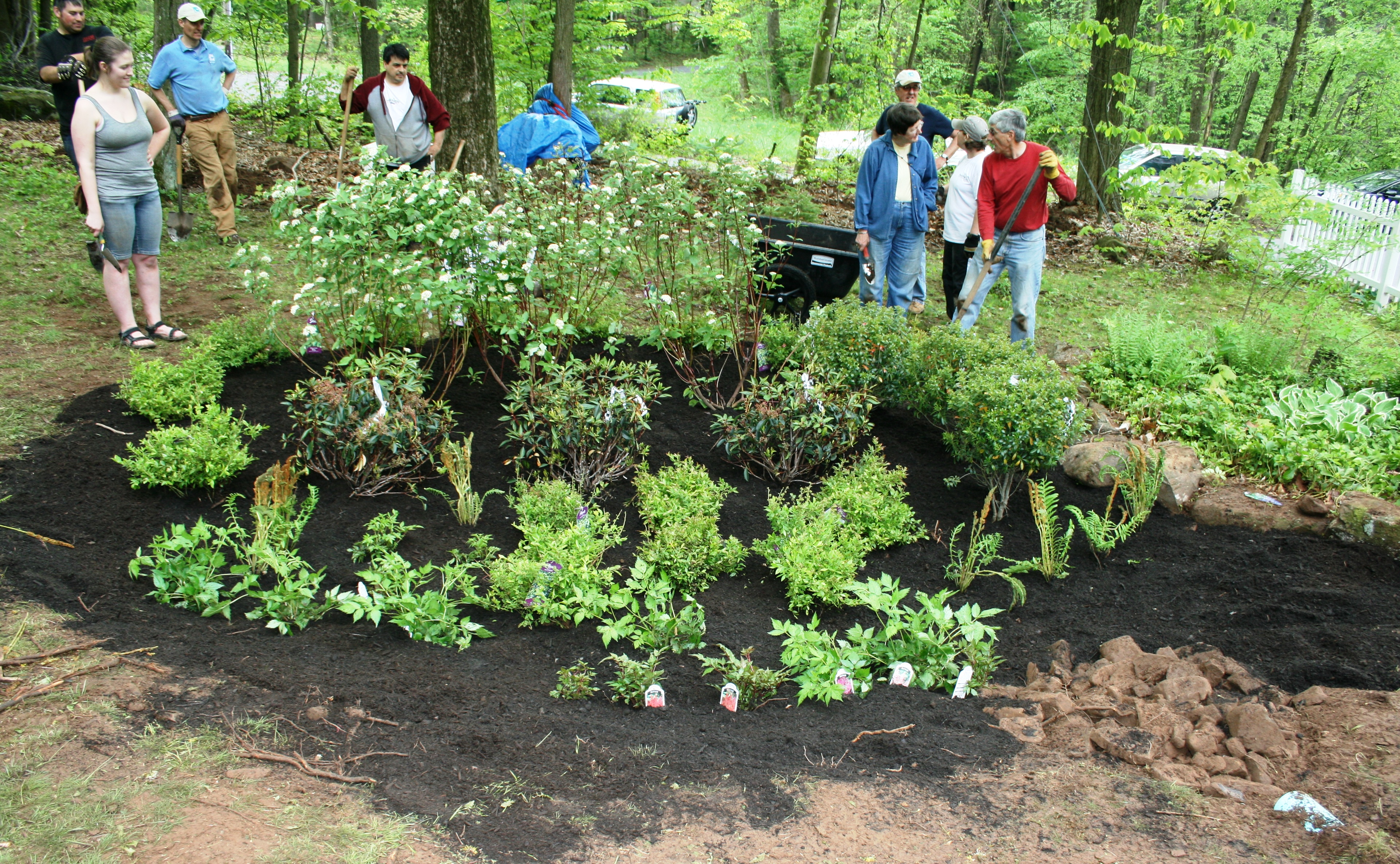 Despite the rainy weather, volunteers spent four hours constructing the garden, planting White Astilbe, Lowbush blueberry, Cinnamon fern, Mountain laurel, Inkberry and Red-osier dogwood.