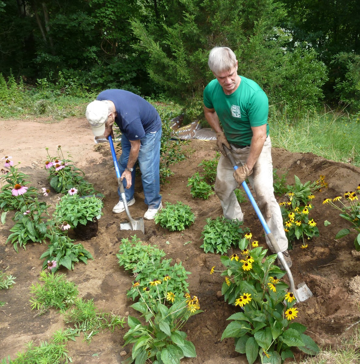 Volunteers dig rain garden retention area above Clark Pond and prepare it to plant a mix of native plants that can survive short wet spells as well as drought.