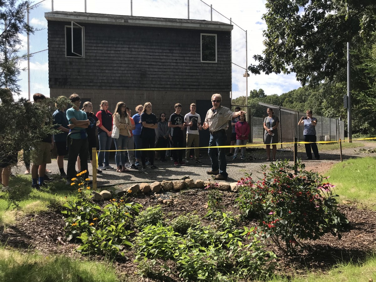Greg Decker, FOHNP chief steward, explains the purpose of the new rain garden to high school students on a field trip.