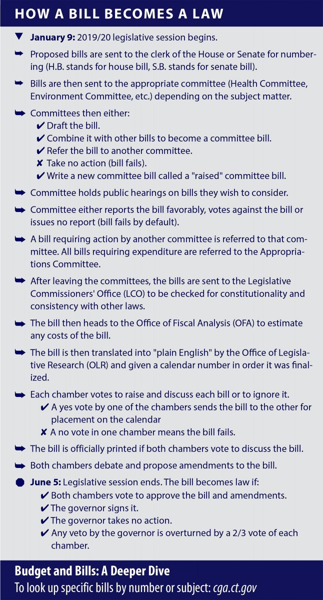 Legislative Session: Connecticut has a part-time legislature, which means lawmakers are not in Hartford all year long (though you can reach out to them anytime!). Odd-numbered years are “long sessions” (January to June) and focus on passing the state budget. In even-numbered years, the session runs from February to May, the “short session,” and makes budget adjustments. During the first half of each session, the House and Senate usually only meet one day a week, but daily near the end of session. The rest of the time, your reps attend committee meetings and public hearings.