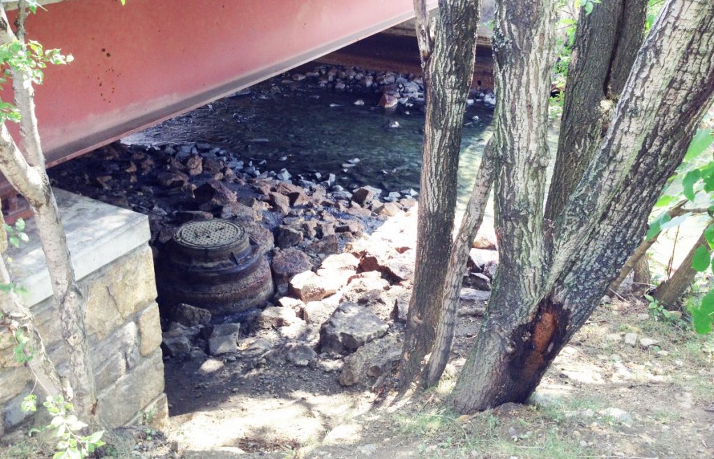Sewage manhole under the foot bridge at Glover Field that overflows