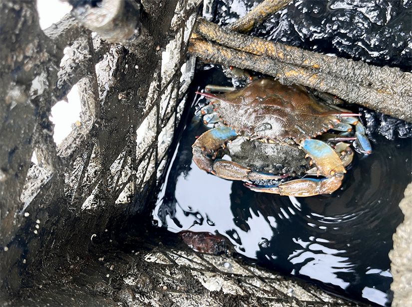 Julia spotted this blue crab during water quality sampling on the Hutchinson: “Little guy feels pretty emblematic of a creature doing its best to live life in the ruins.”