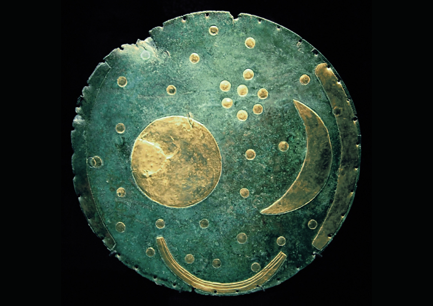 A sacred map etched in bronze, the Nebra Sky Disc (1800–1600 BC) is humanity’s first known map of the cosmos, reflecting an ancient curiosity to understand both earth and the heavens.