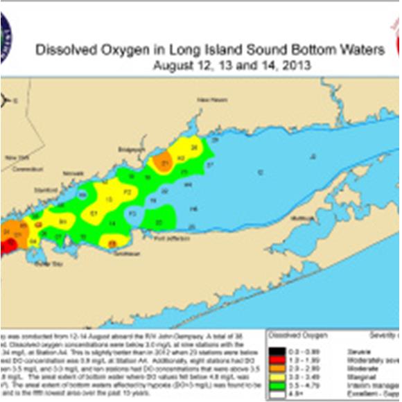 The results are in: compared to last year, the summer of 2013 on Long Island Sound wasn’t so bad for marine life. Water quality as measured by dissolved oxygen improved over the dismal conditions in 2012 and only a relatively small area saw drastically low dissolved readings.