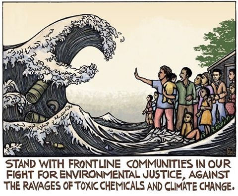 Enviro Justice Credit-.Ricardo Levins Morales, scratchboard, ink, and watercolor