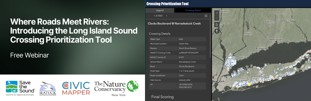 The tool helps communities plan improvements that restore habitat for diadromous fishes, strengthen infrastructure against climate change, and keep communities connected. Save the Sound staff will provide a brief overview of the larger project behind the tool and lead a live demonstration showing how it can be applied in the watershed.