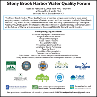 The Stony Brook Harbor Water Quality Forum presents a unique opportunity to learn about ongoing research and science-based efforts to protect and improve water quality in Stony Brook Harbor, Long Island Sound, and West Meadow Creek.