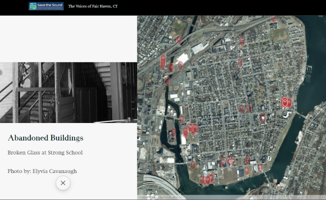 Over 100 photos were taken throughout the course. Participants selected the final 50 showcased in the PhotoVoice exhibit (slideshow below) and interactive storymap. The following five themes or environmental issues were identified: Green and Blue Spaces, Abandoned Buildings, Trash Travels, A Safe Place?, and The Houseless. The physical exhibit traveled through the Fair Haven Public Library and Junta for Progressive Action, accompanying discussions and presentations to the larger community. Now, our digital exhibit and storymap continue to engage our audience with these impactful images.
