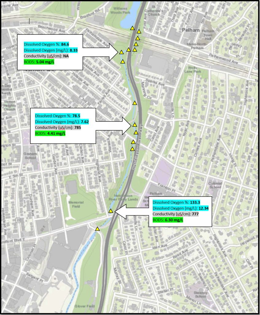 Abiotic measurements were collected at predetermined points along the Hutchinson River by each of the groups. A YSI probe is an electronic device that can be placed in the water to collect some of the abiotic measurements, and was used to collect data on temperature, dissolved oxygen, and water conductivity. An opaque water collection bottle was used to analyze biological oxygen demand at three points along the route. Biological oxygen demand (BOD5) is defined as the amount of oxygen consumed by bacteria and other microorganisms in a specific volume of water. A BOD5 of 5mg/L or above suggests some type of sewage or treated effluent pollution in a waterbody. The data collected suggests there is a moderate amount of sewage and/or treated effluent in the Hutchinson River. The data can viewed below: