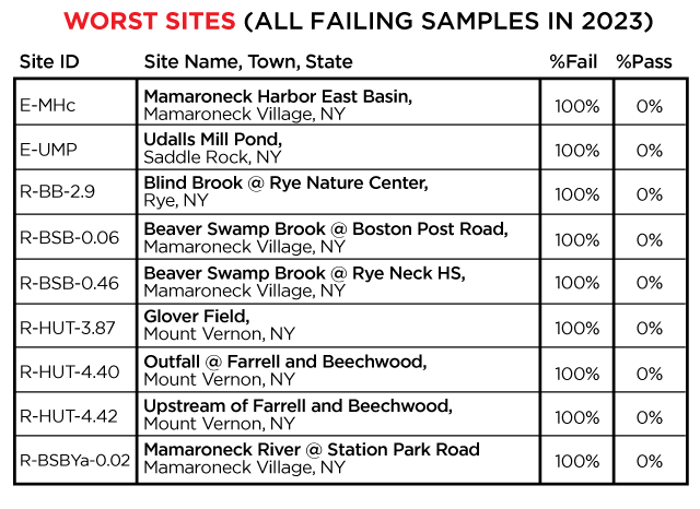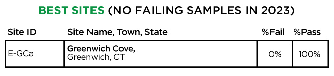 In 2023, Save the Sound collected and tested water quality from Greenwich, CT, through Westchester County, to Queens, and into Nassau County. Samples were analyzed for fecal indicator bacteria, Enterococcus in marine water and E. coli in freshwater, which are used to determine if waters are safe for swimming. Click on each site on the map above to see what we found. The colors reflect average bacteria levels at each site. The “% Pass” and “% Fail” show how many samples passed or failed the single sample criteria for safe swimming in New York and Connecticut.