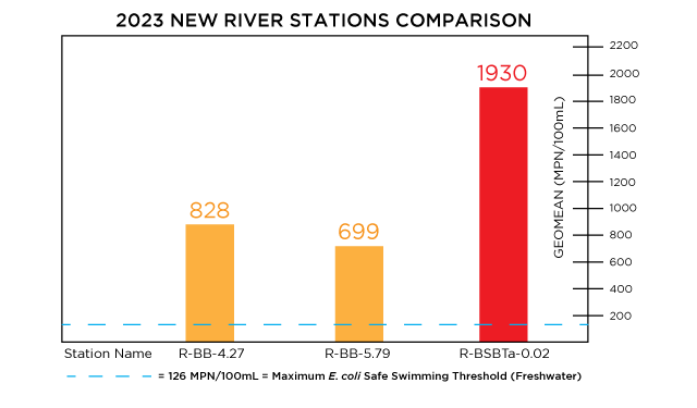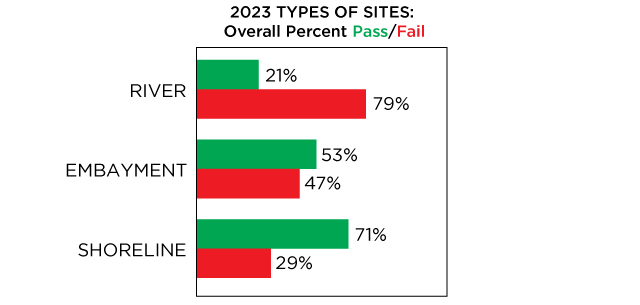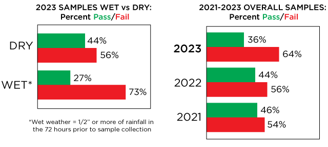 Overall fecal contamination rates increased from 2022 to 2023 from 56% to 64%.Three additional river stations added in 2023 all had high failure rates, which contributes to the higher overall failure rate this season. An increase of 3% in dry weather failures occurred this year. The wet weather failure rate decreased by 1%.