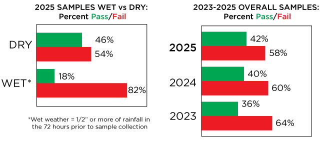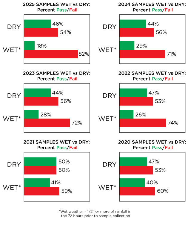 Dry weather samples tend to pass at a higher rate than wet weather samples, and 2025 clearly reflected this disparity. Of the 622 dry samples collected this year—the most we’ve ever collected in a monitoring season—46% passed. That’s a 2% increase over the previous two seasons (both 2023 and 2024 saw 44% of samples pass) and, again, is comparable to 2022 (47%).