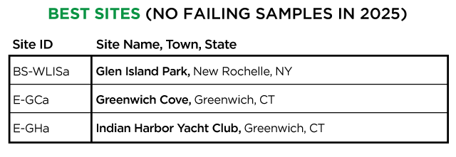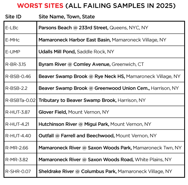 In 2025, Save the Sound collected and tested water quality at 66 locations from Greenwich, CT, through Westchester County, to Queens, and into Nassau County. Samples were analyzed for fecal indicator bacteria Enterococcus in marine water and E. coli in freshwater, which are used to determine whether waters are safe for swimming. Click on each site on the map above to see what we found. The colors reflect average bacteria levels at each site over the 12-week monitoring season. The “% Pass” and “% Fail” show how many samples passed or failed the single sample criteria for safe swimming in New York and Connecticut.