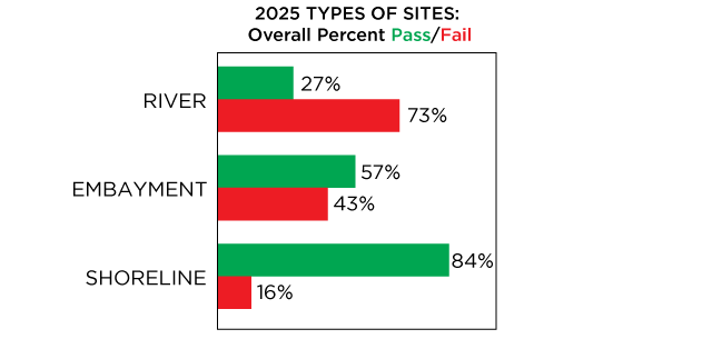 Failure rates at shoreline sites (16%) were the lowest since 2022 (16%). Embayments were the only sites that failed more often in 2025 (43%) than the year before (41%).